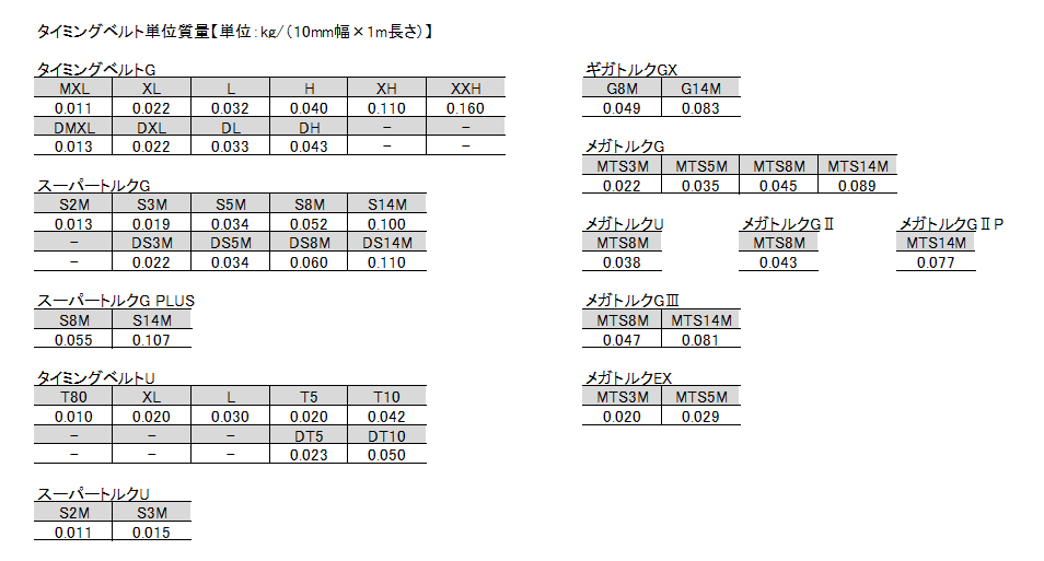 標準ベルトの単位質量は下記の通りです。